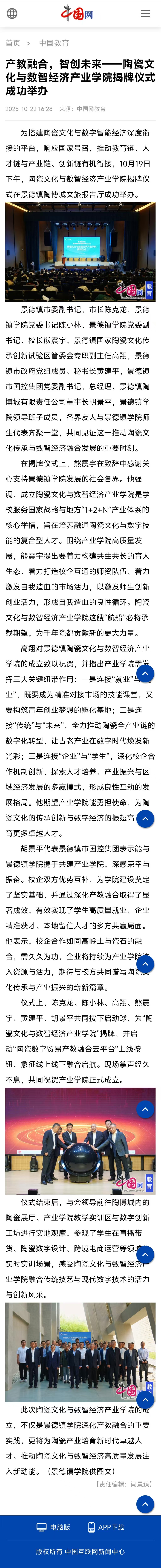 中国网:景德镇学院举办产教融合,智创未来——陶瓷文化与数智经济产业学院揭牌仪式
