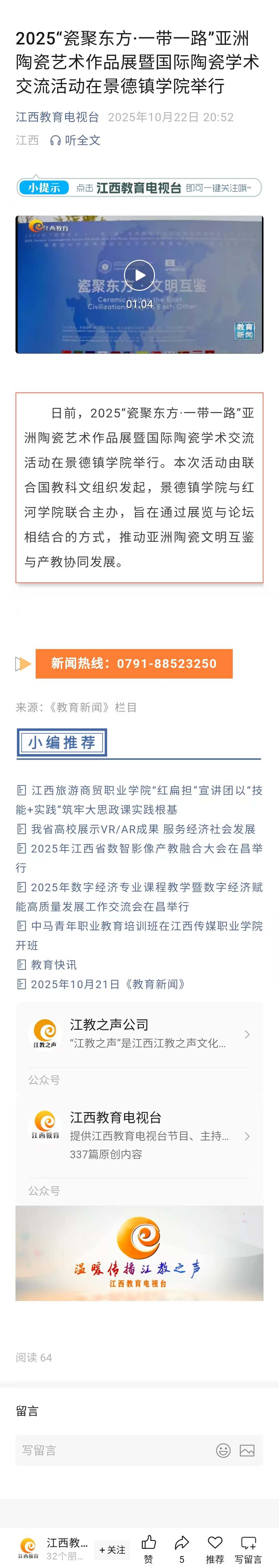 江西教育电视台:2025“瓷聚东方·一带一路”亚洲陶瓷艺术作品展暨国际陶瓷学术交流活动在景德镇学院举行