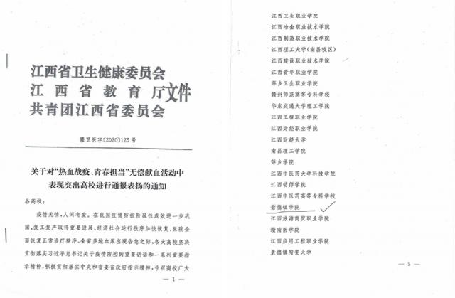 (本网讯:张琳)近日,江西省卫生健康委员会、江西省教育厅和共青团江西省委员会联合发文通报表扬在2020年度“热血抗疫,青春担当”无偿献血工作中表现突出的高校,我校获全省通报表扬。 为贯彻和落实习近平总书记关于疫情防控的重要讲话精神,...