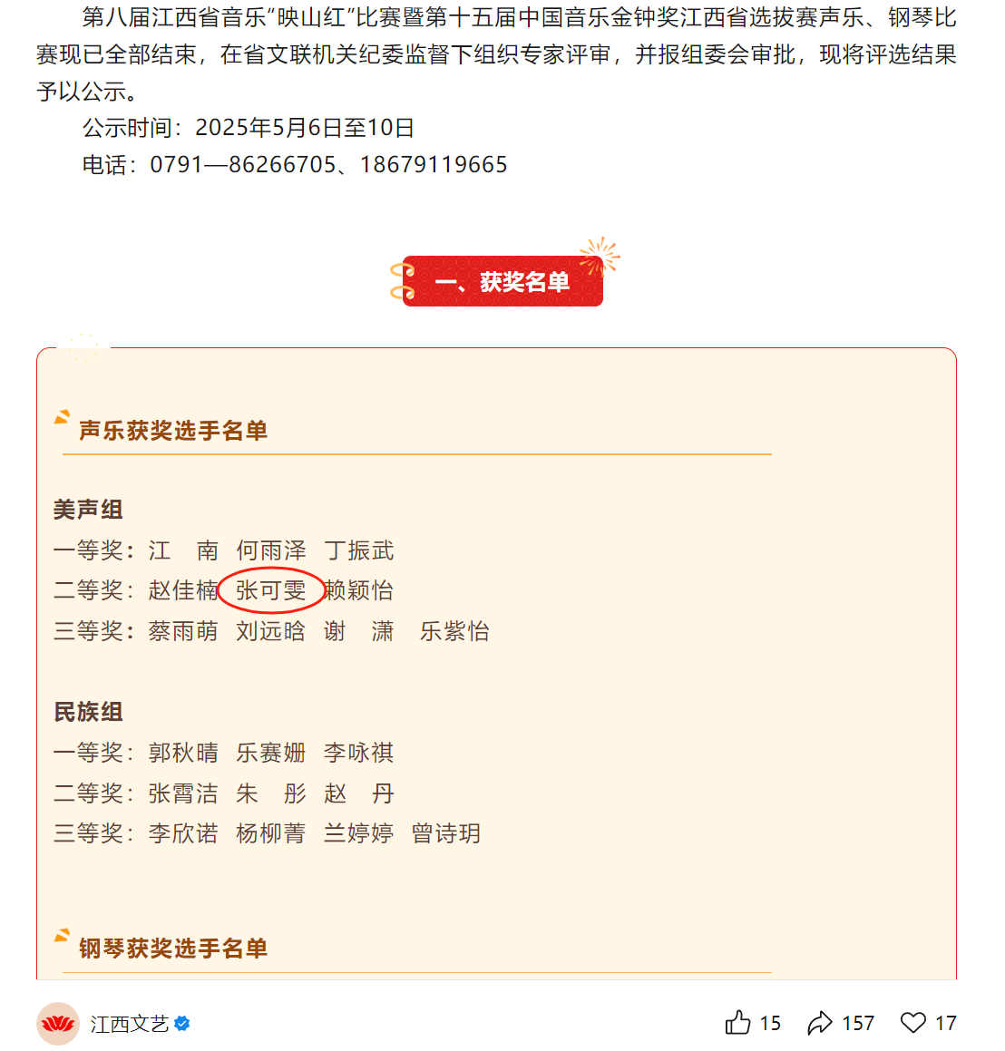 (本网讯:蔡沐涵)近日,第八届江西省音乐“映山红”专业比赛暨第十五届中国音乐金钟奖声乐比赛江西省选拔赛圆满落幕。音乐舞蹈学院教师张可雯凭借精湛的专业技艺和出色的舞台表现,在比赛中脱颖而出,一举斩获决赛二等奖。...