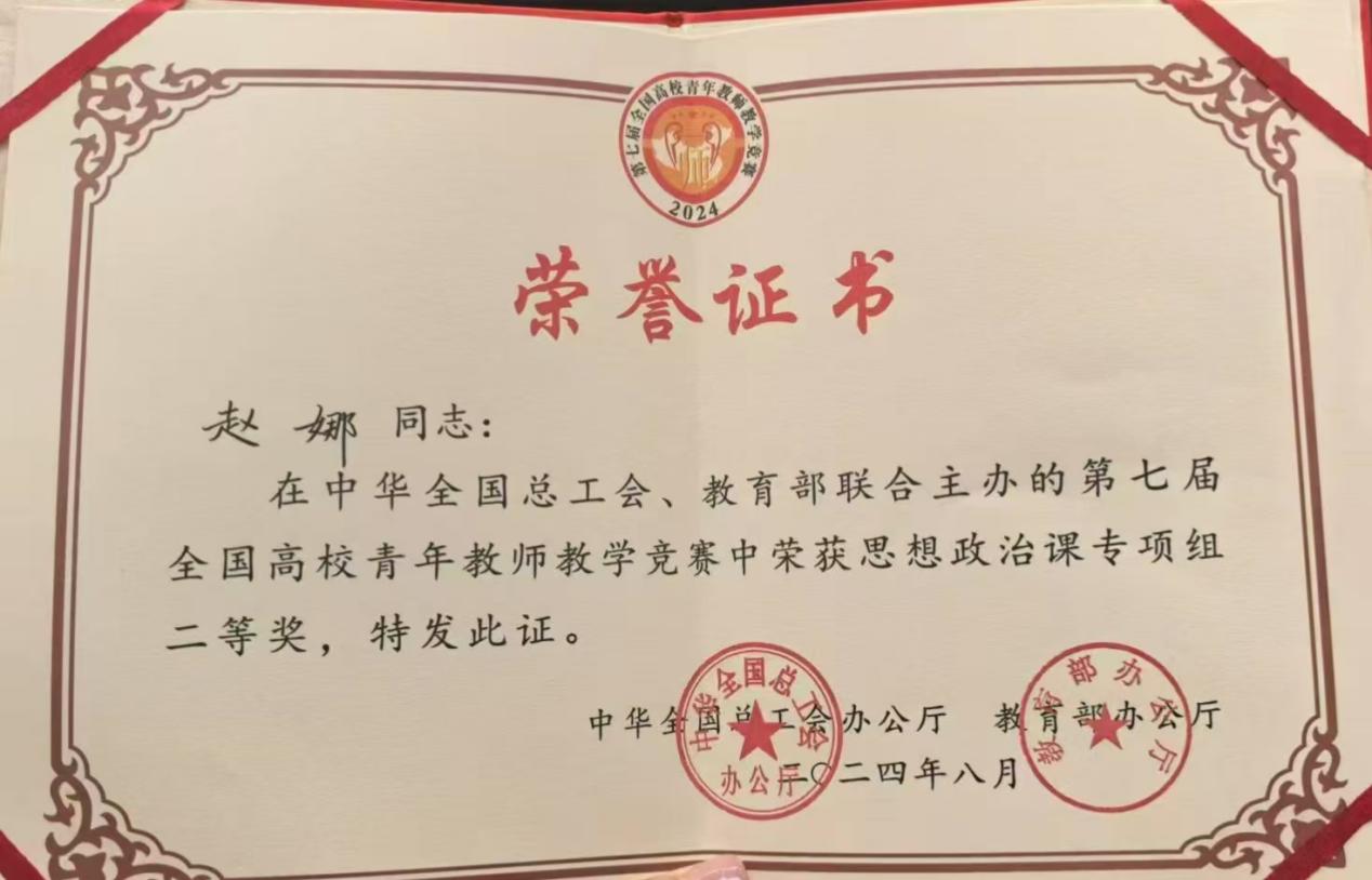 (本网讯:余洪权)8月26至30日,由中华全国总工会、教育部联合主办,中国教科文卫体工会、教育部教师工作司联合承办的第七届全国高校青年教师教学竞赛决赛在上海交通大学成功举办。我校马克思主义学院青年教师赵娜荣获思想政治专项组二等奖,...