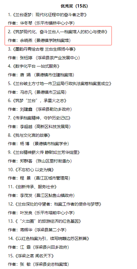 (本网讯:档案轩)近日,由市档案局、市档案馆联合主办,市档案学会承办的2024年国际档案日“筑梦现代化 奋斗兰台人”主题征文结果揭晓,我校档案馆馆长余文霞征文作品《兰台之光——档案人的现代化奋斗曲》...