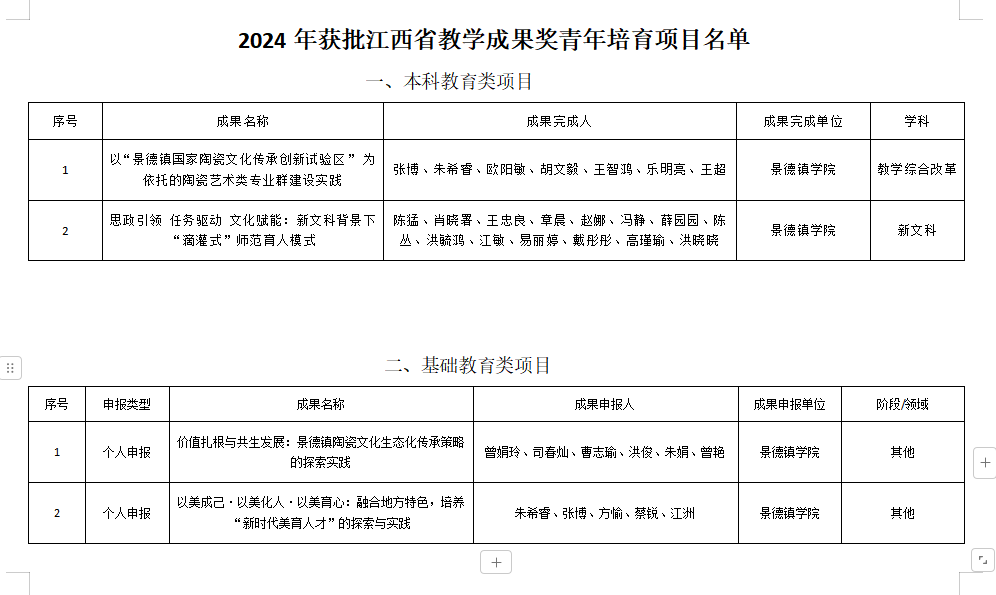 (本网讯:曾娟玲)近日,江西省教育厅公布了2024年江西省教学成果奖青年培育项目名单,我校获批了4项省级教学成果奖青年培育项目,涵盖基础教育和本科教育。本次成果奖申报中我校共推荐了7个项目,获批率达50%以上,...