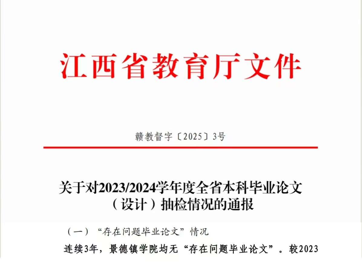 (本网讯:朱梦琪)近日,江西省教育厅公布了2023-2024学年度全省本科毕业论文(设计)抽检情况,我校被抽检的本科毕业论文(设计)再次全部通过,这标志着我校在本科毕业论文(设计)抽检中已连续三年取得100%...