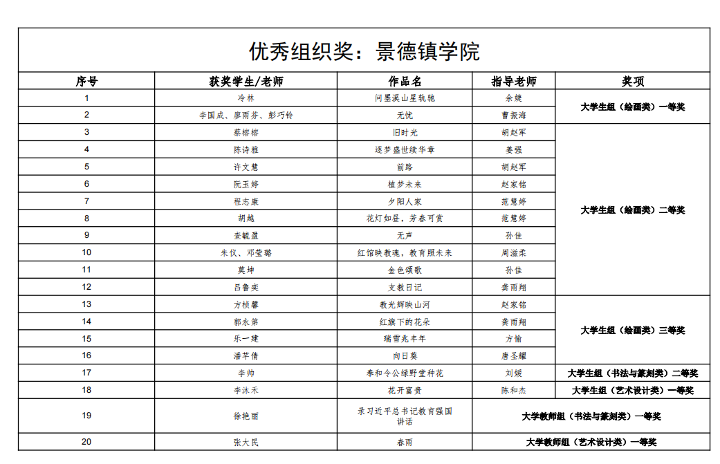 (本网讯:王思怡)近日,江西省第十二届“艺德杯”大中小幼师生艺术作品征集活动拟获奖名单正式公示,我校师生共荣获各类奖项29项,我校荣获“优秀组织奖”,展现了我校在艺术教育领域的卓越实力和组织能力。 获奖公示&...