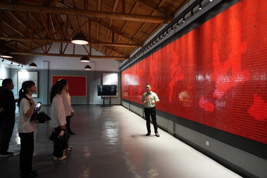 随后,讲解员带领宣讲团同学们来到百年党史红艺馆。通过丰富的实物展品,同学们沉浸式地感受了党带领人民从苦难走向辉煌的艰辛历程。此外,宣讲团同学们还在讲解员的引领下于巨幅瓷板画前观看“共产党宣言”。讲解员为同学们深入讲述了“共产党宣言”瓷板画的创作过程以及艺术成就。