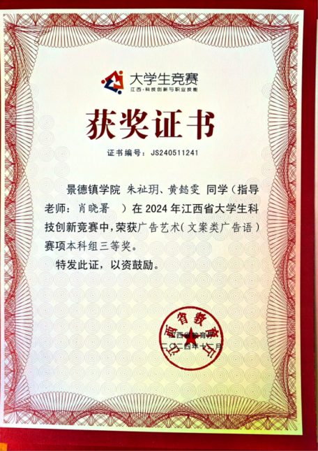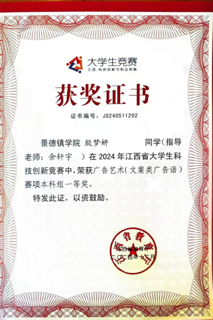 (本网讯:钟国轩、刘清)在深化应用型本科教育改革与产教融合的浪潮中,我校人文学院再传捷报。在最近刚落幕的2024年江西省大学生科技创新竞赛中,人文学院汉语言文学专业学子勇创佳绩——殷梦妍、李婧怡斩获广告艺术(文案类)本科组一等奖2项,朱祉玥、黄懿雯团队获同赛项三等奖1项,这一成绩不仅刷新了人文学院自参赛以来的最佳纪录,更标志着学院“产教融合、能力导向”的应用型转型战略取得实质性成效。