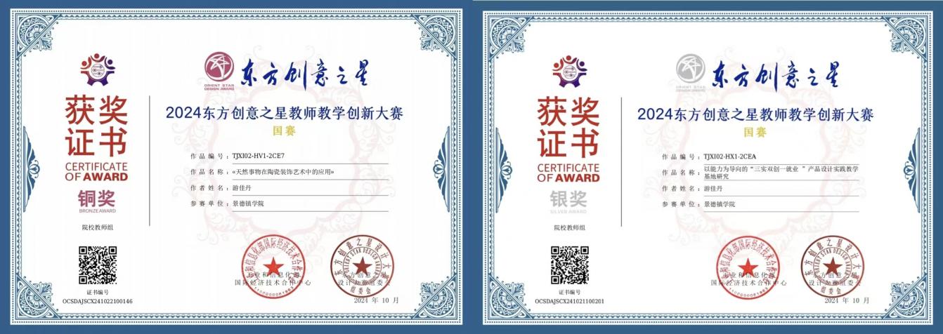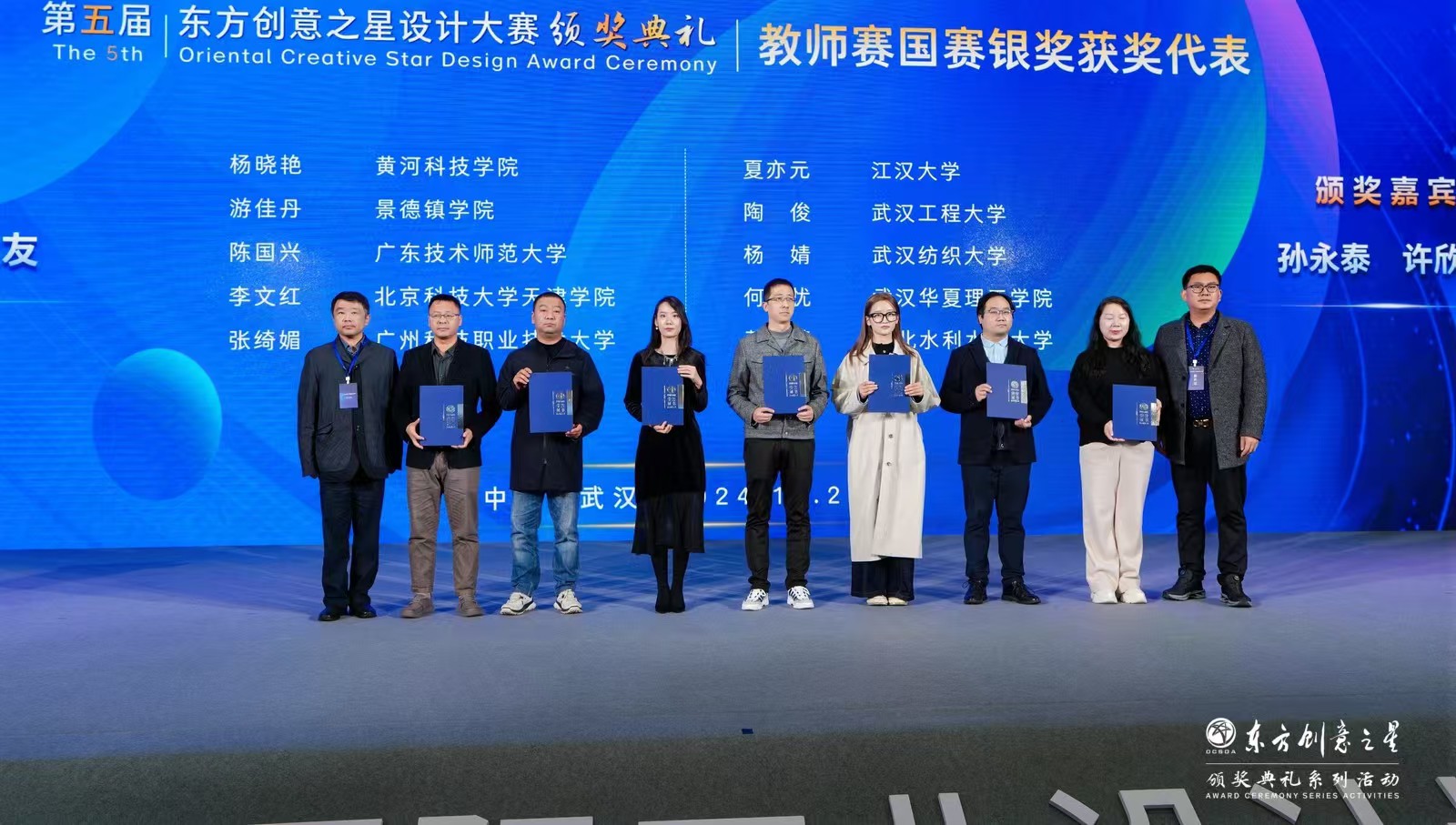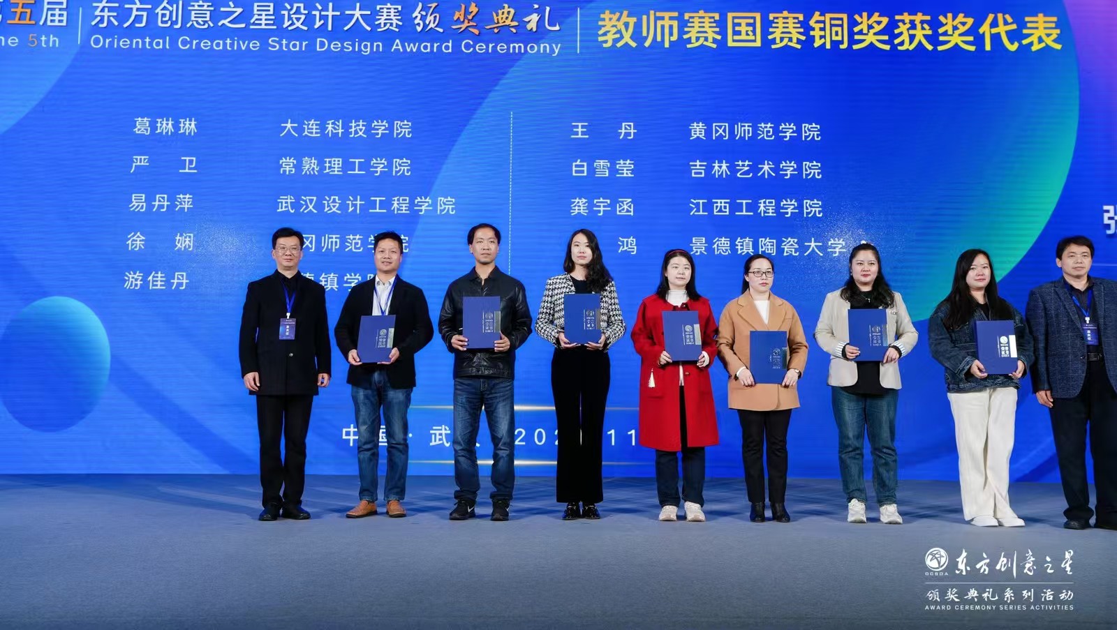 (本网讯:王锦瑶)近日,由工业和信息化部国际经济技术合作中心批复举办的第五届东方创意之星教师教学创新大赛全国总决赛获奖名单正式揭晓,颁奖典礼系列活动在武汉顺利举办,我校陶瓷美术与设计艺术学院教师游佳丹荣获银奖1项、铜奖1项。