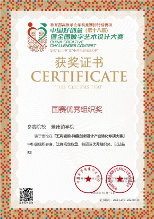 此外,我校其他学生作品也在本次大赛中获奖。其中李白璐、方愉老师指导的学生作品《磁悬浮陶瓷创意茶具》获得国家三等奖,唐娇、陈驰老师指导的学生作品《星环织梦》获得国家优秀奖,洪瑶老师指导的学生作品《万物生》获得国家优秀奖。洪瑶老师获国赛优秀指导教师奖,李白璐、方愉老师获省赛优秀指导教师奖,洪瑶老师还在本届大赛中荣获特殊贡献奖。