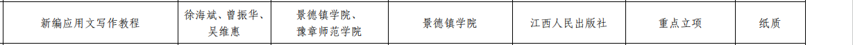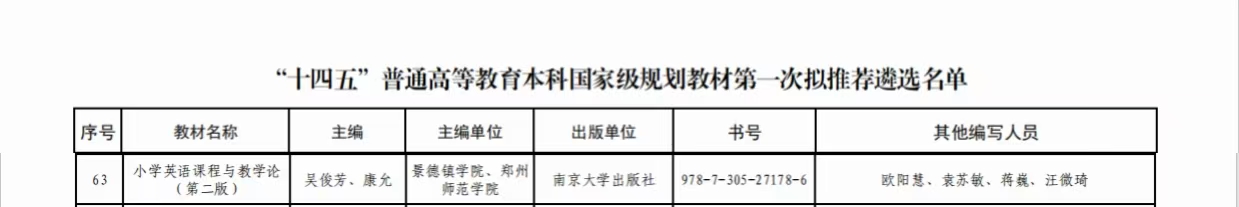 (本网讯:黄依婷)近日,江西省教育厅公布了《关于公布首批江西省“十四五”普通高等教育本科省级规划教材入选、立项建设名单的通知》(赣教高字〔2024〕41号),我校申报的4部教材获得遴选、立项。其中,吴俊芳等主编的《小学英语课程与教学论(第二版)》入围国家级规划教材第一次拟推荐遴选名单和省级规划教材拟遴选名单,方漫主编的《陶瓷古彩装饰》和徐海斌、吴维惠等主编的《新编应用文写作教程》入围省级规划教材重点立项教材,胡祥青、付淑英、黄新华主编的《大学物理》入围省级规划教材拟遴选教材,