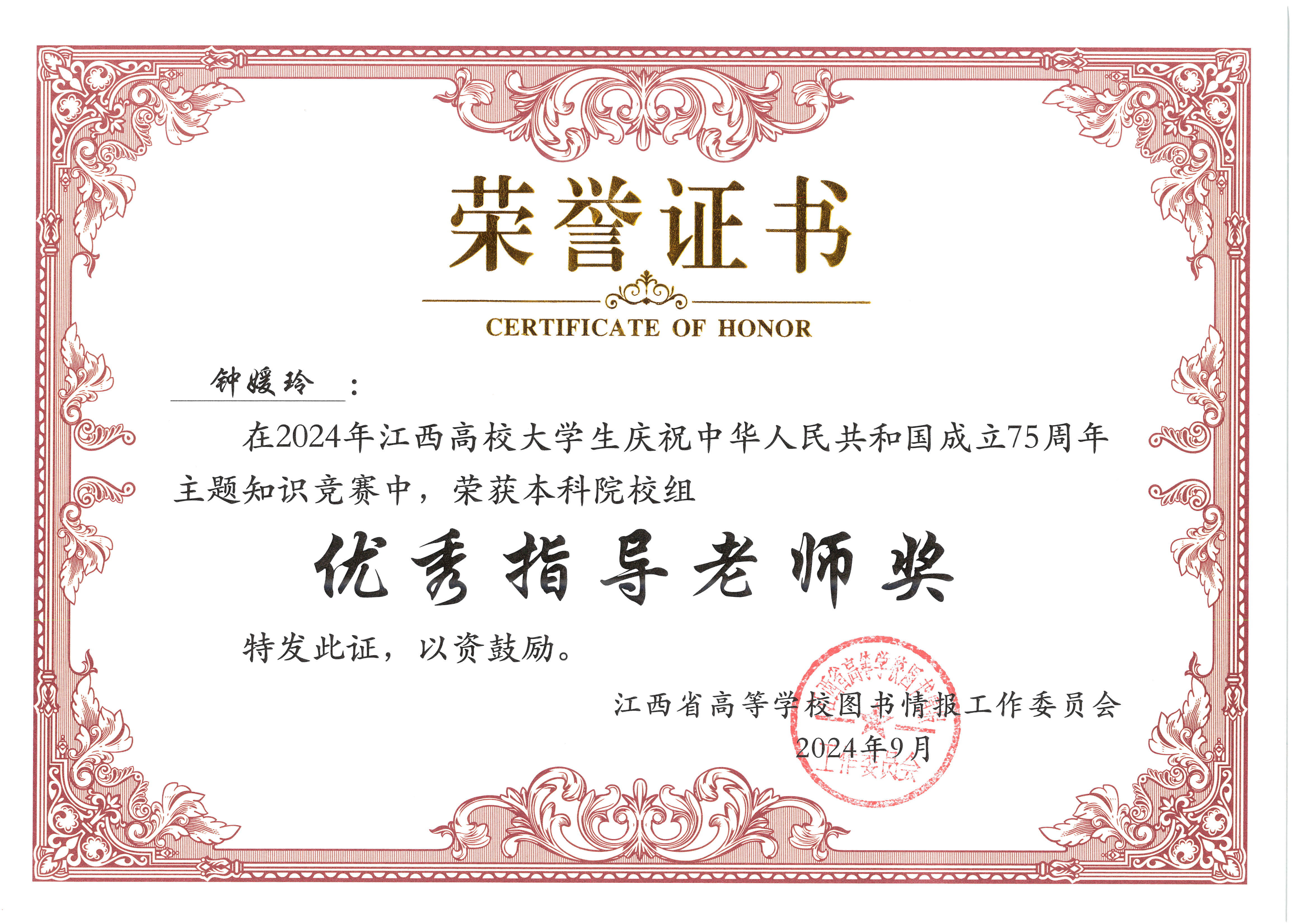 (本网讯:钟媛玲)近日,在江西省高等学校图书情报工作委员会主办,宜春幼儿师范高等专科学校承办,中科软股教育科技北京股份有限公司协办的首届“中科杯”礼赞新中国奋进新时代,庆祝中华人民共和国成立75周年主题知识竞赛的决赛场上,由我校图书馆负责择优选拔组织的代表队凭借扎实的知识储备、出色的临场发挥,一路过关斩将,最终以总分第二名的成绩斩获二等奖、优秀组织奖、优秀指导教师奖。