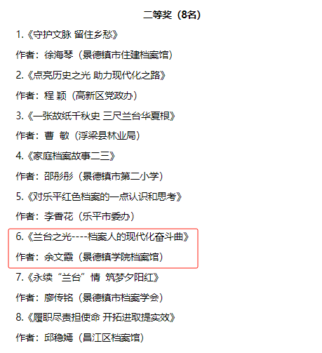 (本网讯:档案轩)近日,由市档案局、市档案馆联合主办,市档案学会承办的2024年国际档案日“筑梦现代化 奋斗兰台人”主题征文结果揭晓,我校档案馆馆长余文霞征文作品《兰台之光——档案人的现代化奋斗曲》获二等奖,馆员余晓燕征文作品《筑梦现代化,奋斗兰台人——档案馆人的初心与使命》获优秀奖。
