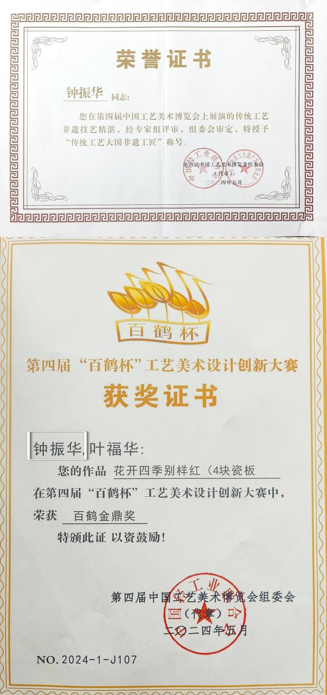 同时,其作品《花开四季别样红(4块瓷板)》在第四届“百鹤杯”工艺美术设计创新大赛中荣获百鹤金鼎奖。