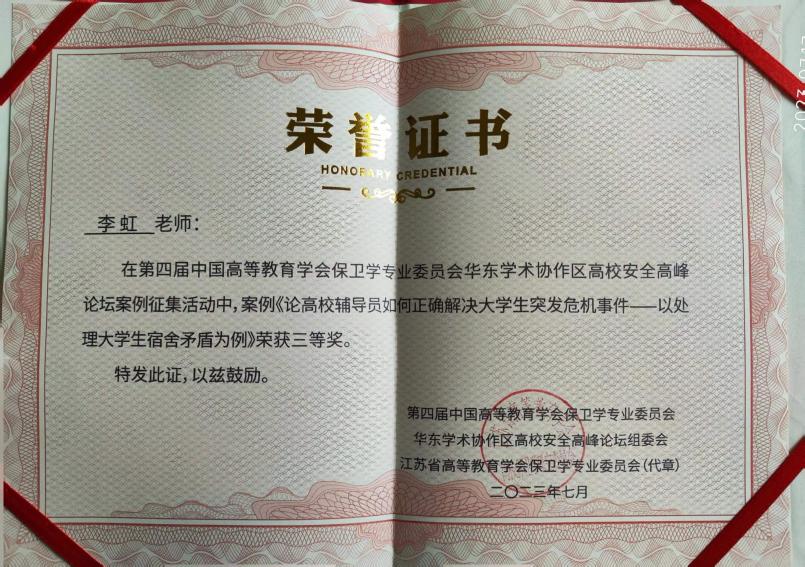(本网讯:李虹)近日,第四届中国高教学会保卫学专业委员会华东学术协作区高校安全高峰论坛在苏州举行,论坛上评选了各高校选送的保卫工作优秀案例,我校李虹老师荣获优秀案例三等奖。