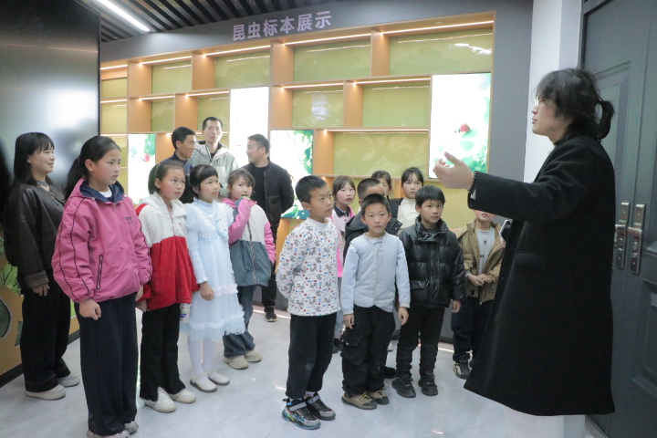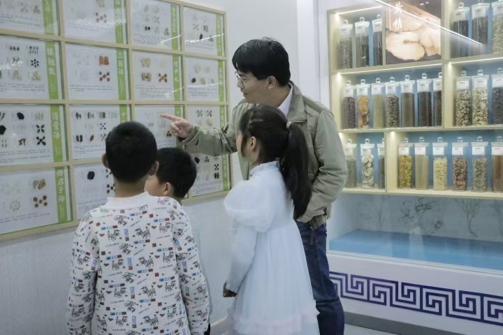 活动中,孩子们在专业讲解员带领下走进中医药标本馆,沉浸式感受中医药文化的博大精深。在中药植物标本展区,艾草、陈皮、蒲公英、黄芪等常见中药材标本整齐陈列,讲解员用通俗易懂的语言讲解植物的外形特点、生长环境和药用功效,将专业知识转化为生动的科普故事,引导孩子们近距离观察、主动提问交流,在潜移默化中为孩子们心中播下了科学探索与传统文化传承的种子。